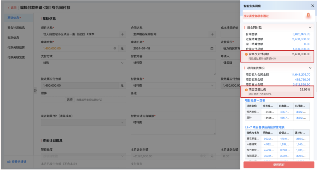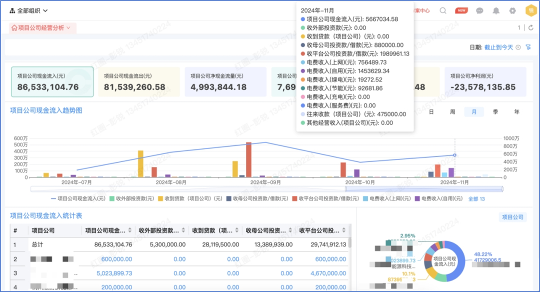 通過系統實時看得到公司資金情況,明確知道哪些項目能有資金去做去投資、哪些資金要計劃對外結算支付,項目現在開了多少票、還有多少錢沒有回,同時也能對進度款、質保金、投標保證金等回款設置提醒,防止逾期未回。項目墊資情況也能同步關注,判斷公司的經營狀況是否穩健。