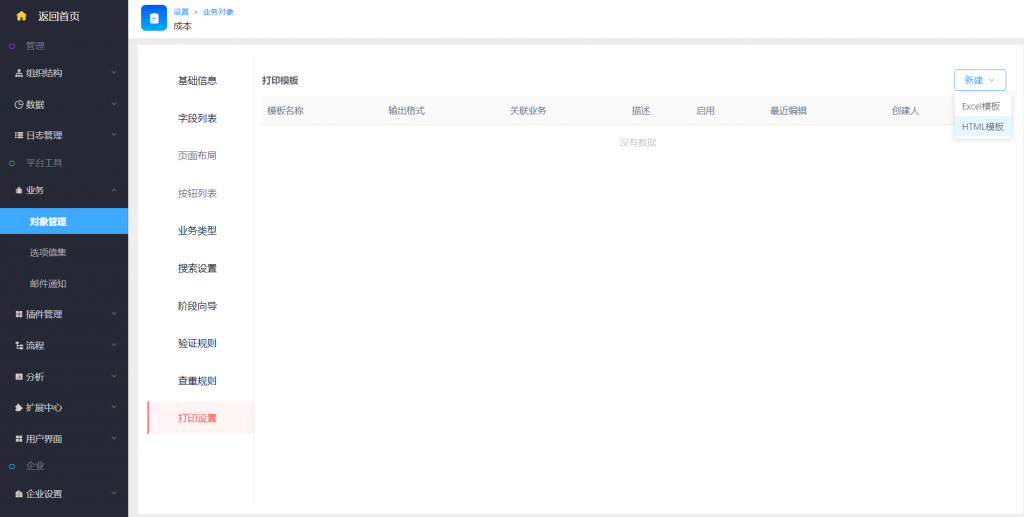 - 配置和普通excel模板打印設置在一起,路徑為:系統設置——業務——對象管理——打印設置。