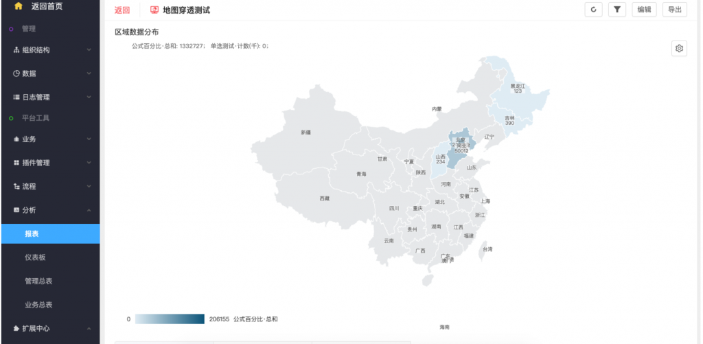 - 地圖可設(shè)置默認(rèn)顯示區(qū)域,區(qū)域可進(jìn)行向下鉆取,如點(diǎn)擊北京市,可查看北京各區(qū)的數(shù)據(jù)。每個(gè)區(qū)域的顏色代表數(shù)值的大小,顏色越深數(shù)值越大