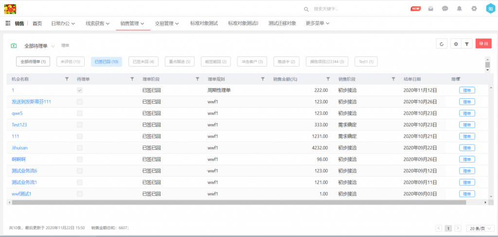 1) 理單頁面顯示及邏輯調整,單獨顯示待理單數據和按理單階段顯示全部銷售機會,理單后數據直接顯示到指定的理單階段;