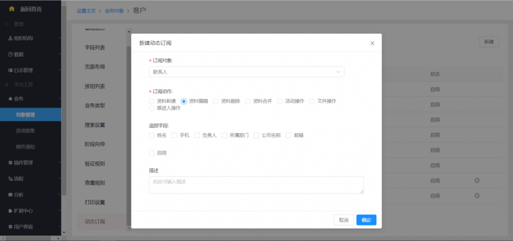 系統設置——業務——對象管理——動態訂閱——新建