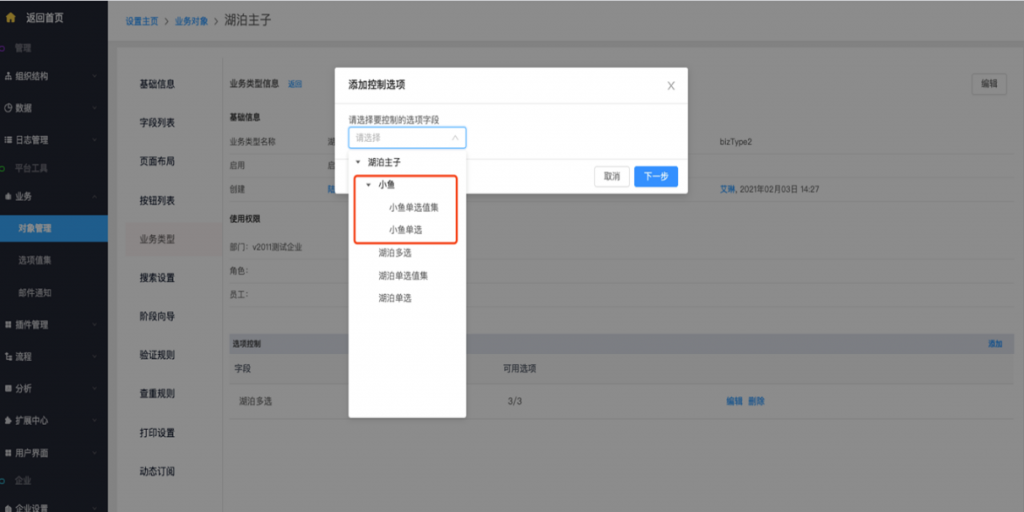 - 主對象業務類型控制子對象:主對象的業務類型可以控制子對象的單選及多選字段