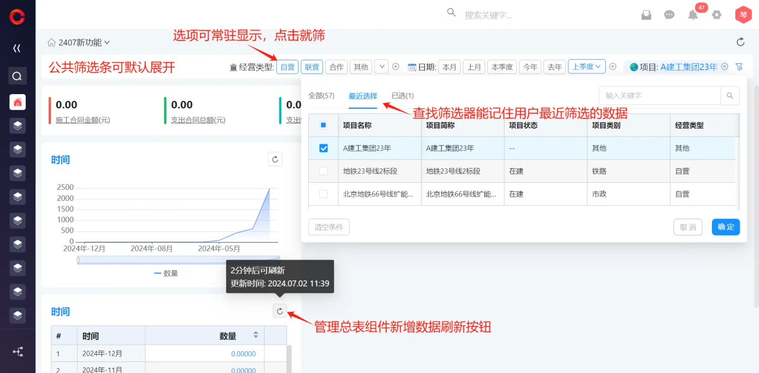 查找篩選器可記錄用戶最近選擇的10條數據,縮短尋找數據的時間