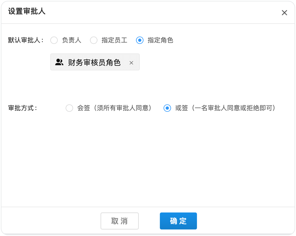 如果小王的公司對(duì)報(bào)銷把控比較嚴(yán)格,要求兩個(gè)財(cái)務(wù)審核同事全部同意后流程才能通過,那么可以在后臺(tái)將他們?cè)O(shè)置成“多人會(huì)簽”。