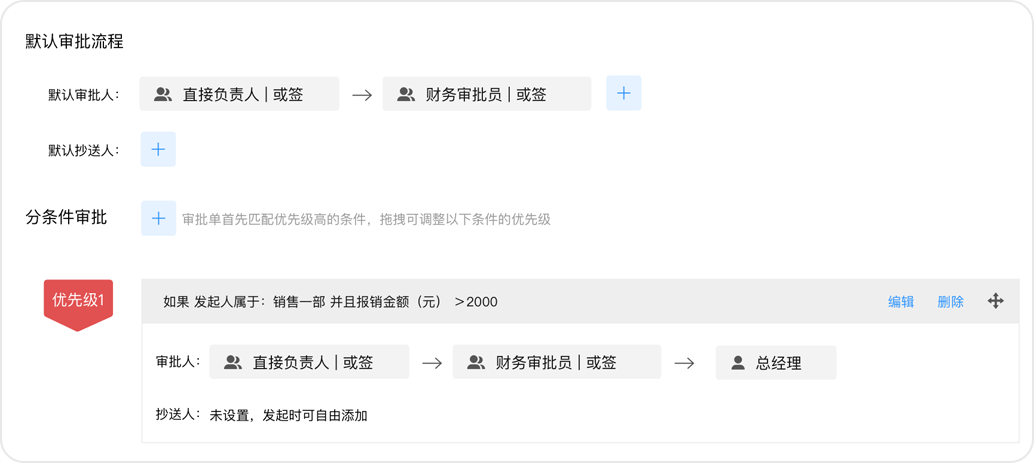 小王這次要報(bào)銷2500元的出差費(fèi)用,而公司規(guī)定報(bào)銷超出2000元就需要總經(jīng)理進(jìn)行額外審批。這種情況可以通過設(shè)置“分條件審批”功能來實(shí)現(xiàn),將報(bào)銷金額是否大于2000作為判斷應(yīng)該走哪一條流程的條件:1)金額小于等于2000元時(shí),流程按“直接負(fù)責(zé)人-財(cái)務(wù)審核員”執(zhí)行;2)金額大于2000元時(shí),流程按“直接負(fù)責(zé)人-財(cái)務(wù)審核員-總經(jīng)理”執(zhí)行。分條件審批不僅可以設(shè)置按金額判斷,還可以設(shè)置按發(fā)起人部門、報(bào)銷類型等判斷。