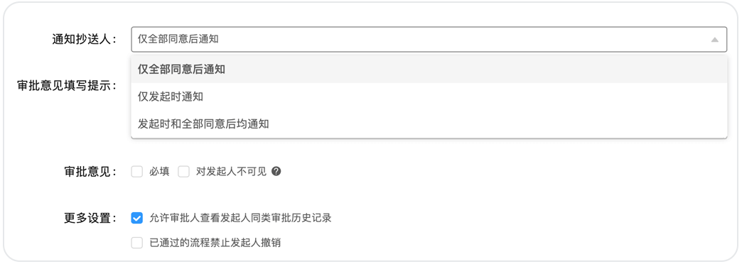 小王的出差報(bào)銷最終通過了,這時(shí)還需要抄送給辦公室的行政同事以便日后進(jìn)行成本分析。過去,報(bào)銷審批一經(jīng)發(fā)起就抄送給了行政同事,但有些審批后期撤銷了但沒有通知行政同事,造成后期分析時(shí)數(shù)據(jù)存在誤差,現(xiàn)在可以通過設(shè)置“僅全部同意后通知”的抄送模式來避免這一問題。抄送共有3種模式,企業(yè)可根據(jù)實(shí)際場(chǎng)景靈活選擇。