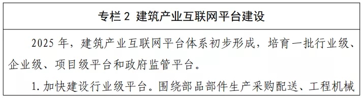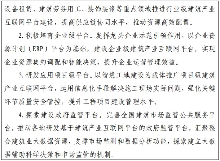開(kāi)展建筑產(chǎn)業(yè)互聯(lián)網(wǎng)平臺(tái)建設(shè)試點(diǎn),培育一批行業(yè)級(jí)、企業(yè)級(jí)、項(xiàng)目級(jí)建筑產(chǎn)業(yè)互聯(lián)網(wǎng)平臺(tái),建設(shè)政府監(jiān)管平臺(tái)。