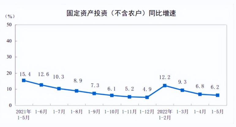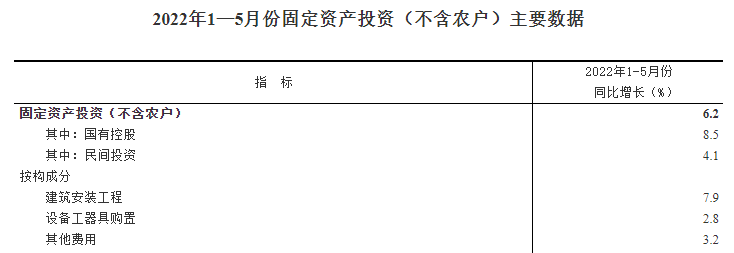 國家統計局發布數據顯示,1—5月份,全國固定資產投資(不含農戶)205964億元,同比增長6.2%。其中,民間固定資產投資117128億元,同比增長4.1%。從環比看,5月份固定資產投資(不含農戶)增長0.72%。