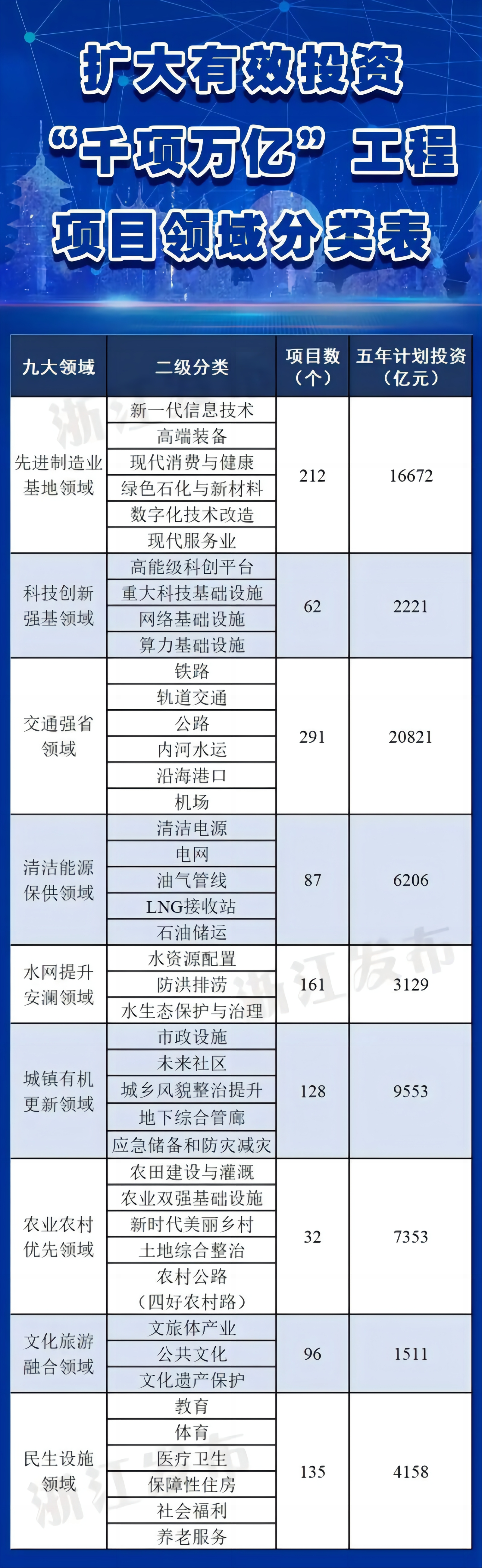近日,浙江省政府辦公廳印發《浙江省擴大有效投資“千項萬億”工程實施方案(2023—2027年)》。