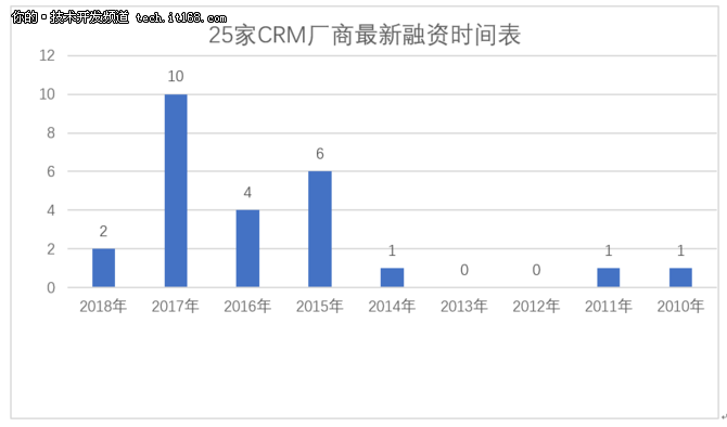 77家網(wǎng)上公開資料搜索到的CRM廠商中有25家是有明確的融資情況,從上圖我們可以看出資本越來越青睞于CRM領(lǐng)域,最新融資情況在2015年-2017年內(nèi)的廠商共有20家,占比為80%,商業(yè)模式的成熟、企業(yè)CRM認(rèn)知的提高以及市場需求或許是資本青睞的主要原因。