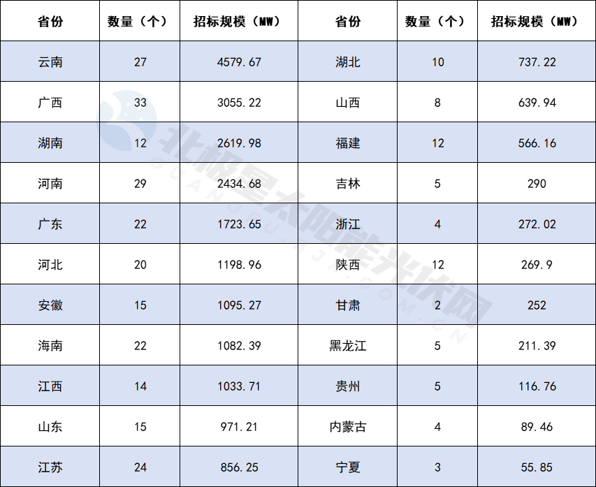 其中,云南以27個項目的總規模4579.67MW排名第一,而廣西則以33個項目的總規模3055.22MW緊隨其后。另外,湖南、河南、廣東、河北、安徽、海南、江西等省份的項目規模也達到了GW級別。