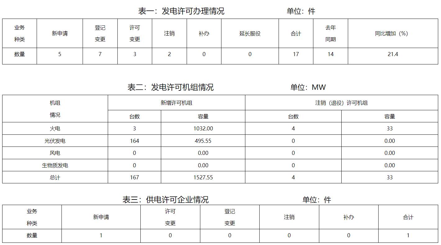 1月份,全省辦理電力業(yè)務許可證(發(fā)電類)共計17件,其中新申請5件,許可事項變更3件,登記事項變更7件,注銷2件。新增許可機組167臺(發(fā)電單元)總?cè)萘?527.55MW。