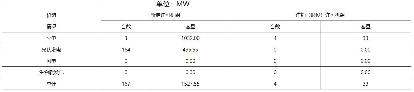 截止1月31日,2024年共辦理電力業(yè)務許可(發(fā)電類)業(yè)務17件,較去年同期增加21.4%,其中新申請5件,登記事項變更7件,許可事項變更3件,注銷2件。新增發(fā)電裝機167臺(發(fā)電單元)總?cè)萘?527.55MW,其中火電1032.00MW,光伏發(fā)電495.55MW。