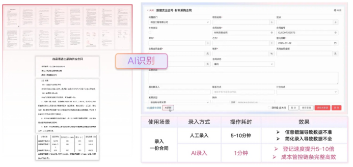 項目竣工階段涉及合同收尾、結算管理與數據歸檔,是實現項目閉環的關鍵。紅圈系統通過合同管理模塊對合同履行、變更與結算過程進行跟蹤,規范合同體系,規避履約風險。合同全生命周期管理功能支持動態實時監察,確保合同條款執行到位,并及時處理爭議與變更事項。同時,紅圈AI系列智能產品中的AI錄單助手能夠自動識別合同關鍵條款,準確提取付款比例、付款條件、價稅金額等信息,為后續履約執行提供重要參照。