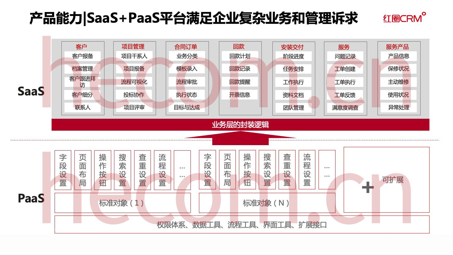 不同行業、不同類型的企業,其組織架構、管理方式和業務流程也不盡相同。而且,隨著企業規模的不斷擴大,客戶關系管理的復雜度也在不斷增加,企業的個性化訴求也會進一步增多。因此,單純的SaaS軟件已經不能完全適應客戶的需求,在這種情況下,CRM的PaaS平臺便應運而生了。
